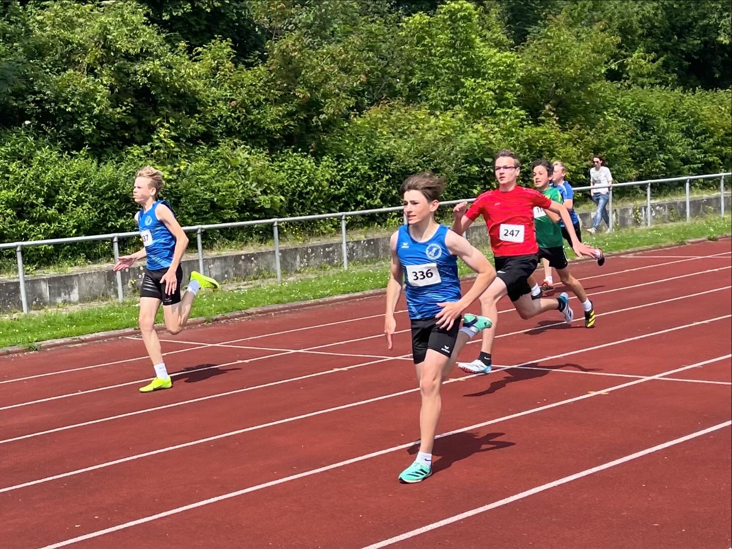 Über die 200m lief Fabian eine gute Kurve und ein starkes Rennen bis 50m vor dem Ziel. In Führung liegend gingen ihm auf den letzten Metern die Körner aus und er hatte dann sehr viel Körpervorlage, was zur Folge hatte, dass er nach der Ziellinie stürzte - ohne große Blessuren. Lohn war auch hier eine neue p. B. von 23,49sec. was für einen guten Mittelfeldplatz reichte. Eine tolle Entwicklung von Fabian bisher.